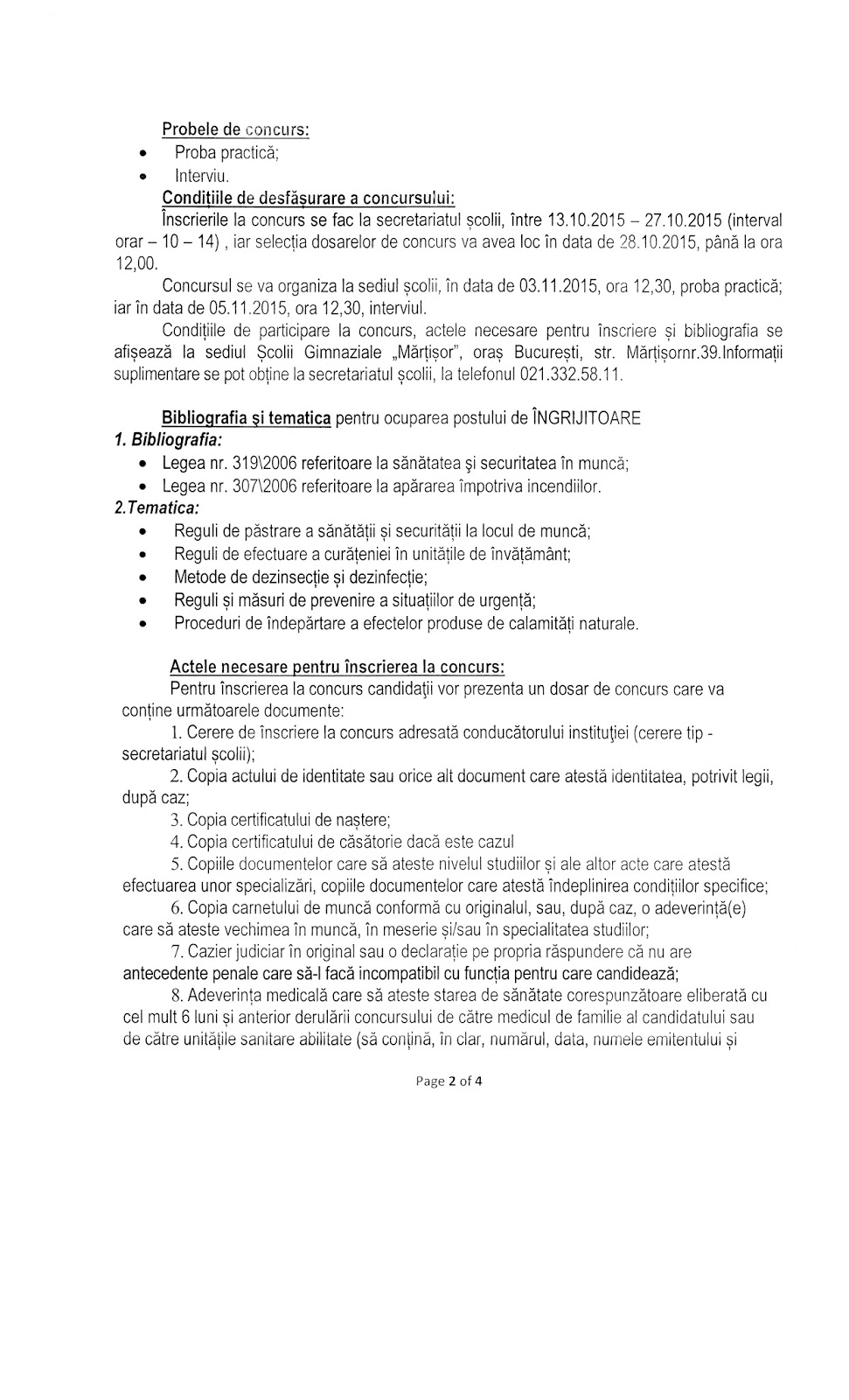 Procedura de efectuare a curăţeniei conţine următoarele operaţiuni. Metode de dezinsecţie şi dezinfecţie. Reguli de efectuare a curăţeniei în unităţile de învăţământ. Punctajul minim obţinut la fiecare probă de concurs este 50 de puncte.