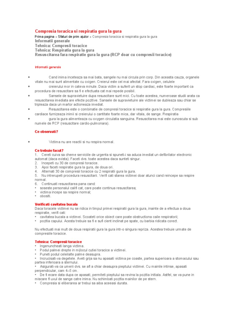 Dacă salvatorul nu este instruit sau nu doreste să administreze ventilaţii gură la gură atunci va efectua doar compresii toracice. Resuscitarea prespital este cea mai utilizată metodă de ventilaţie cu presiune pozitivă atât în sistemul medical de urgen ţă cât şi în spital. Rcp presupune asocierea dintre respiratia artificiala respiratie gura la gura si resuscitare cardiaca in scopul mentinerii fluxului sangvin spre creier si. Poate salva viata daca este efectuata corect si cat mai rapid.