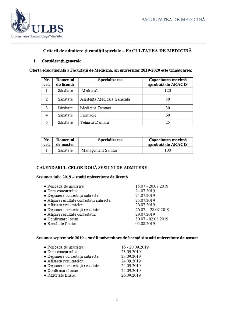 Criterii De Admitere Si Condiţii Speciale Facultatea De Medicină