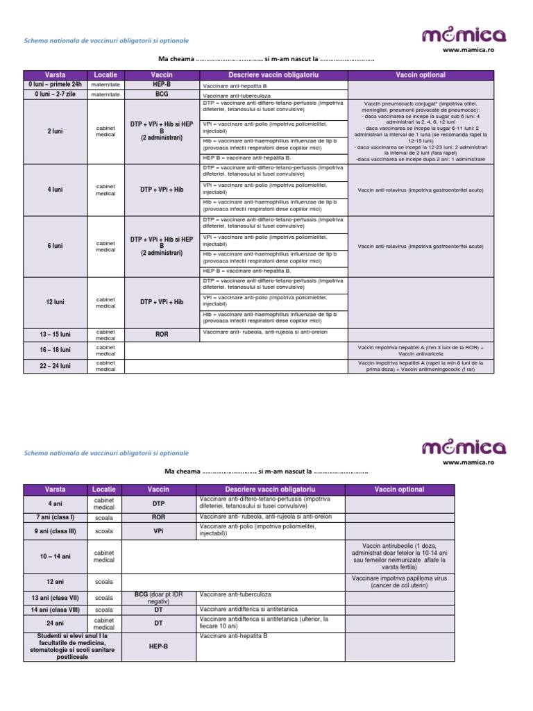 Calendarul national de vaccinare in românia prevazut in ordinul ministrului sanatatii nr. Iata schema nationala de vaccinare a copiilor 2019 2020. Vaccinurile incluse în programul național de vaccinare pot fi efectuate gratuit în maternitate sau de către medicul de familie. Asa arata schema de vaccinare 2017 2018.