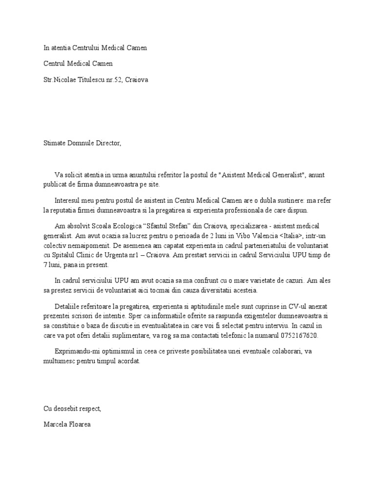 Scrisoare De Intentie Asistent Medical