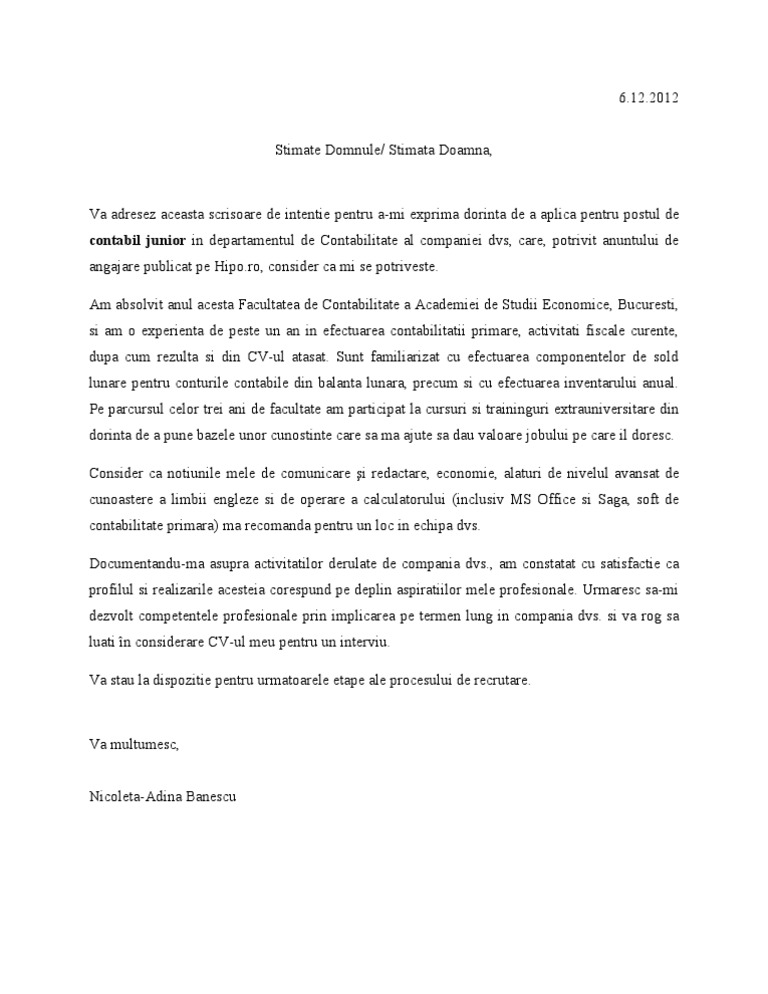 Scrisoare de intentie contabil. Am o experienta de peste trei ani in domeniul contabilitatii dintre care ultimii doi petrecuti in compania y unde am fost responsabil de efectuarea contabilitatii primare activitati fiscale curente. Exemplu de scrisoare de intentie. Ca sa aplicati pentru un loc de munca in uk este necesar sa aveti cv si scrisoare de intentie motivare. Contabilitatea este un domeniu precis si de aceea trebuie sa convingeti angajatorul de capacitatile voastre.