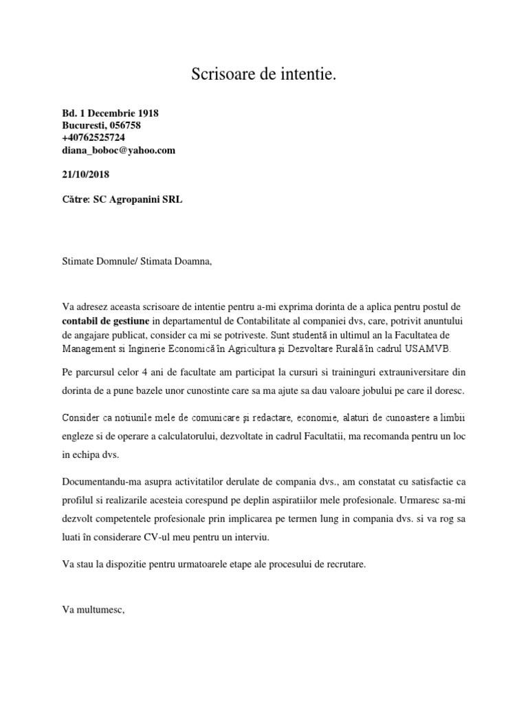 Pentru a ti usura accesul la obtinerea de locuri de munca ti am pregatit o serie de modele de scrisoare de intentie in functie de pregatirea si experienta ta de cariera. Scrisoare de intentie 1 in atentia departamentului resurse umane stimata doamna stimate domn va transmit aceasta scrisoare. Data stimate domnule stimata doamna va adresez aceasta scrisoare de intentie pentru a mi exprima dorinta de a aplica pentru postul de contabil senior publicat pe hipo ro de compania x. Cristi popescu aleea unirii nr 10 032736 bucuresti romania e mail.
