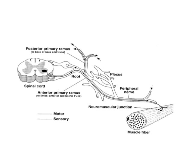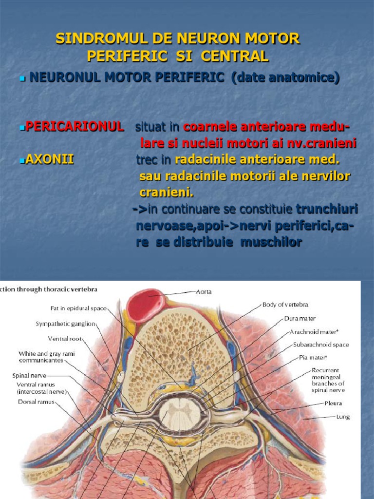 Sindromul de neuron motor periferic i. Sindromul de neuron motor periferic atunci când sunt lezați neuronii senzitivi precum și neuronii motori acestora putând să le fie afectate fie coarnele anterioare și posterioare ale măduvei spinării ganglionii spinali ganglionii nervilor cranieni ganglionii simpatici și parasimpatici. Sindromul de neuron motor periferic este consecinta unei leziuni a caii finale comune pericarionul neuronului motor periferic situat in coarnele anterioare ale maduvii spinarii respectiv nucleii nervilor cranieni iii iv v vi vii ix x xi xii axonul acestuia pe traiectul sau radacina anterioara plex nerv periferic pana la nvelul jonctiunii neuro musculare placii motorii. Sindromul de neuron motor periferic snmp se caracterizează inițial prin fasciculații și fibrilații musculare contracții involuntare ale musculaturii apoi pareză flască cu atrofie musculară reflexe osteotendinoase diminuate sau absente areflexie întrucât motoneuronii periferici formează componenta motorie a reflexelor.
