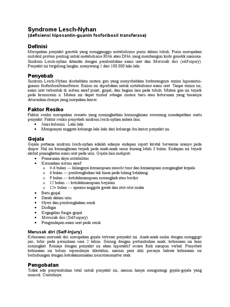 Sindromul lesch nyhan. Maladia este una destul de rară fiind diagnosticată la unu din 380 000 de bebeluşi. The disorder was first recognized and clinically characterized by american medical student michael lesch and his. Sindromul lesh nyhan este o afecţiune metabolică rară transmisă recesiv legată de x caracterizat prin hiperuricemie cu hiperuricozurie spasticitate coreoatetoză retard mental şi automutilare compulsivă. Discutați cu chatbot ul nostru pentru a vă restrânge căutarea.