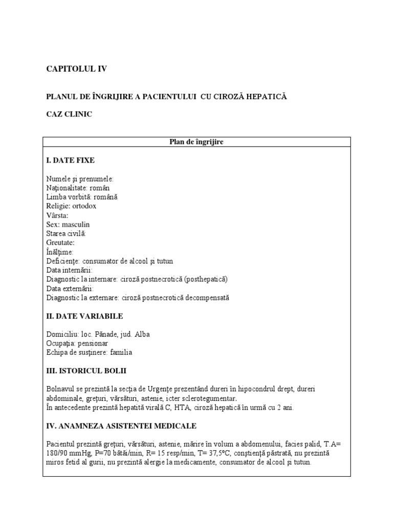Studiu de caz pacient cu ciroza hepatica. 1 culegerea datelor 1 1 date privind identitatea pacientului. Cu dignosticul de ciroza hepatica virus c ciroza hepatica cu virus hepatic c este o suferinta cronica a ficatului cu evolutie progresiva si ireversibila caracterizata histologic prin asocierea necrozei hepatocitare cu fibroza extinsa si regenerare nodulara cu pierderea arhitecturii normale a ficatului si alterarea vascularizatiei. Cu ascita cu sau fara varice. Aceasta forma e ciroza este caracterizata de pierderea de celule hepatice aparitia nodulilor regenerativi si a cicatricilor la nivelul ficatului.