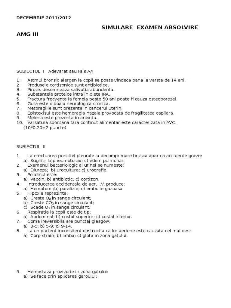 Subiecte Examen Absolvire Scoala Postliceala Sanitara 2018